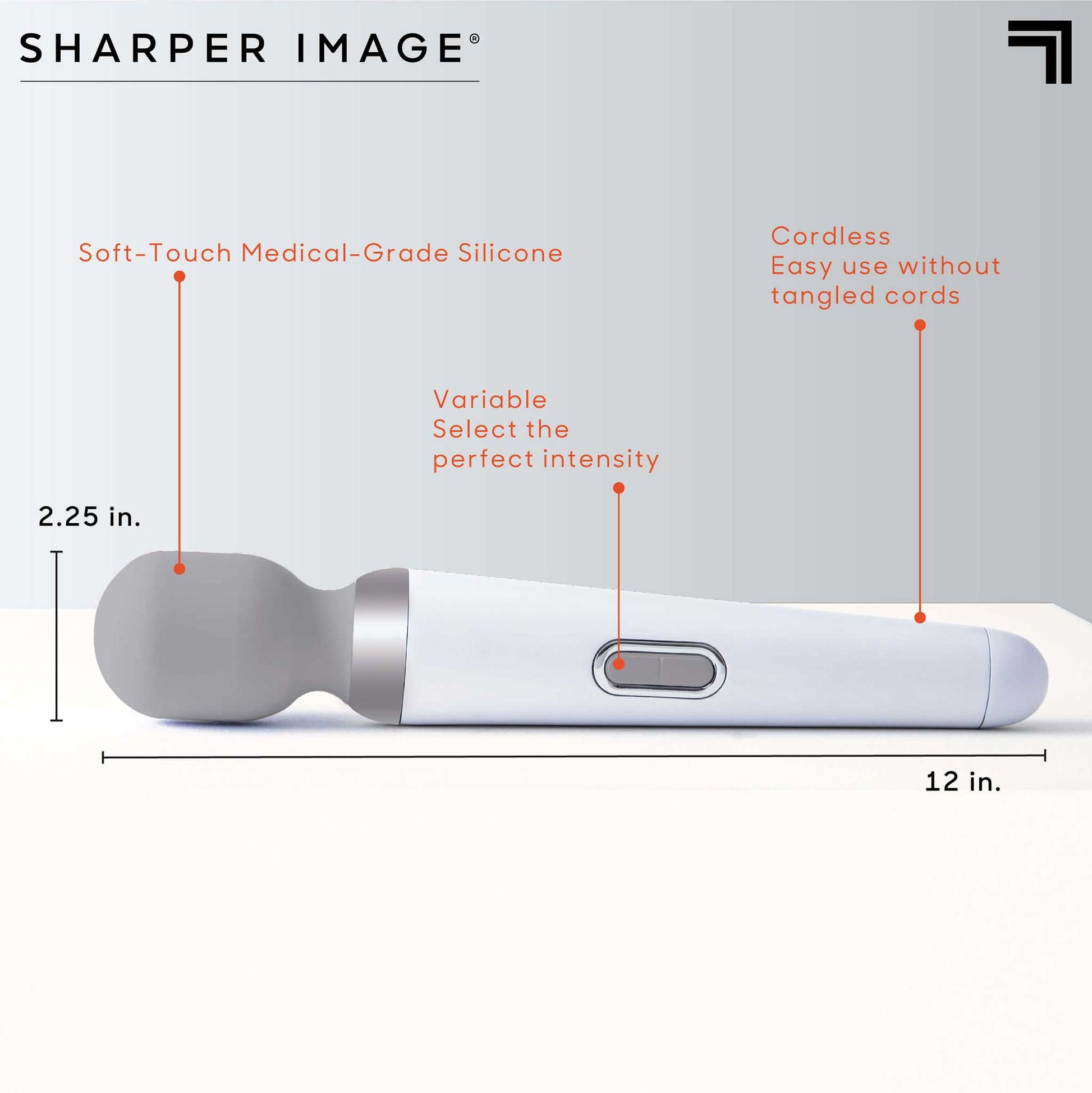 Sharper ImageMassager Personal Touch Full-Size Wireless Wand ger en djup och koncentrerad vibration som mjukar upp trötta och spända muskler. Genom att trycka massageapparaten hårdare mot musklerna kan du öka intensiteten och känna massagehuvudets mjuka och hudvänliga silikon vibrera. Ställ in din massageapparat med 8 ultratysta vibrationsinställningar och njut av en intensiv massage i upp till 2 timmar på en laddning. Denna massageapparat är kompakt och har en resvänlig storlek samtidigt som den är vattenavvisande, uppladdningsbar och trådlös.